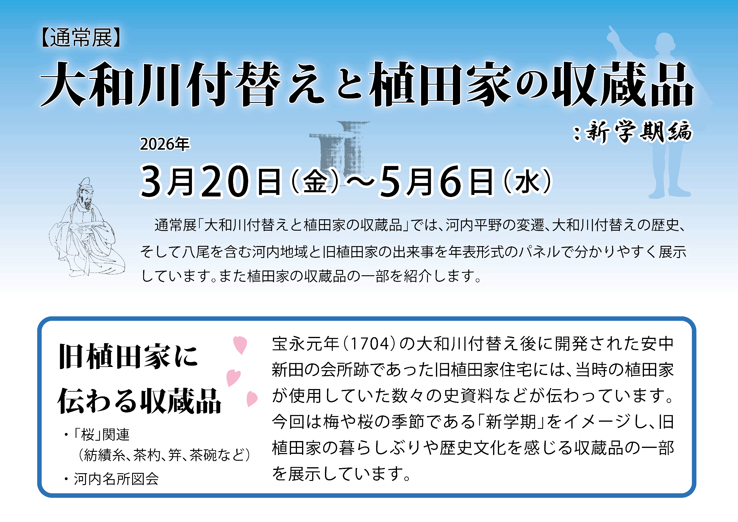 - 旧植田家住宅は、旧大和川主流である長瀬川左岸(旧大和川の左岸)にあり、宝永元年(1704)の大和川付替えによって開発された「安中新田」の会所(屋敷)の地を継承したものです。